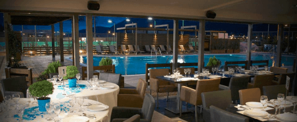 Η αίθουσα δεξιώσεων με κύριο στοιχείο την πέτρα δεσπόζει μπροστά από την φωτισμένη πισίνα και υπόσχεται να χαρίσει ανεπανάληπτες στιγμές για την πιο ευτυχισμένη ημέρα της ζωής σας!