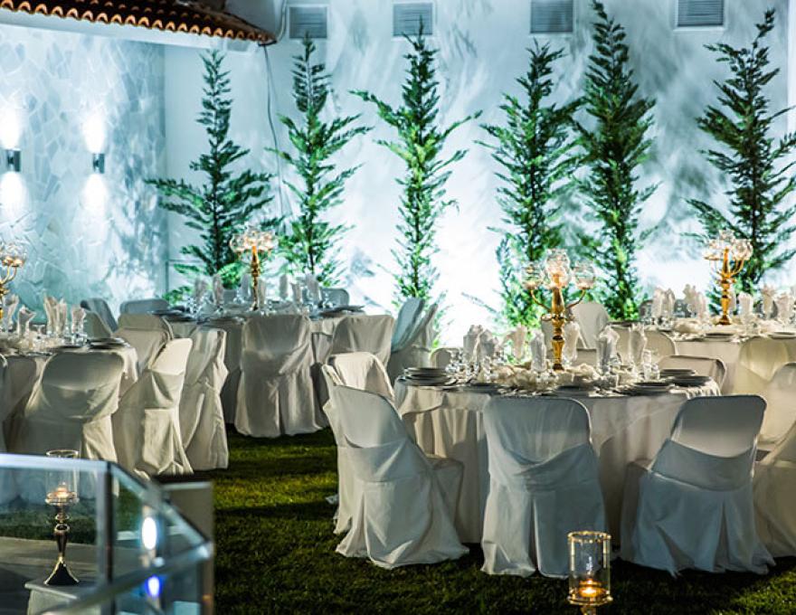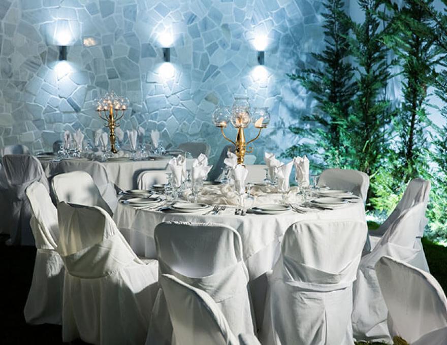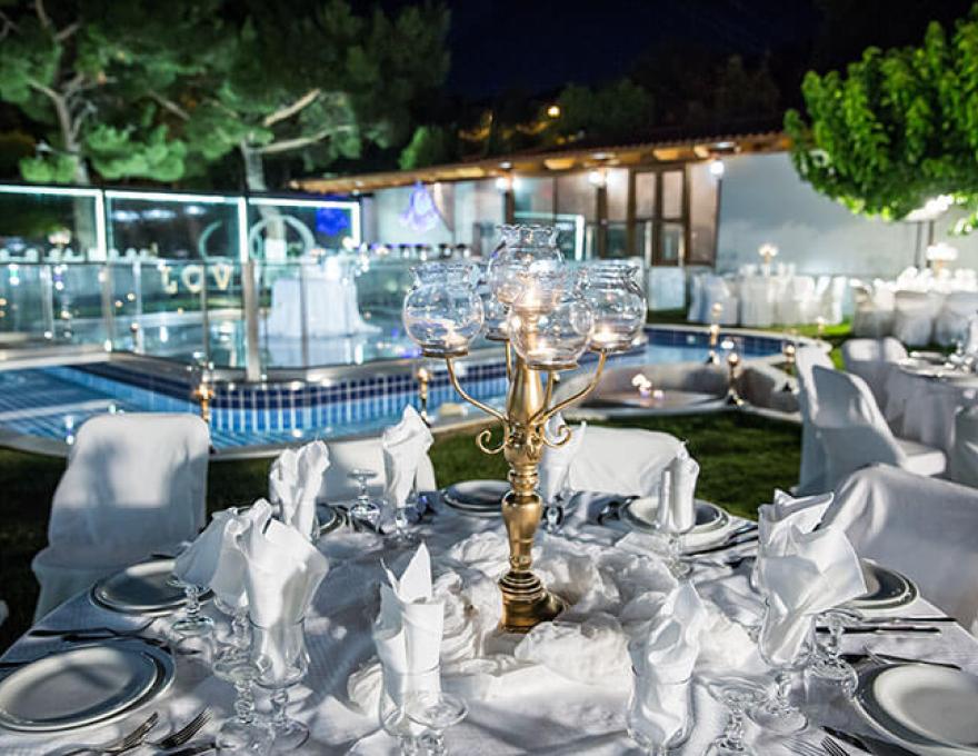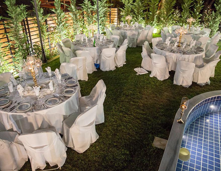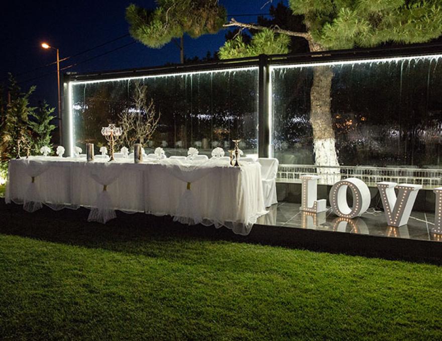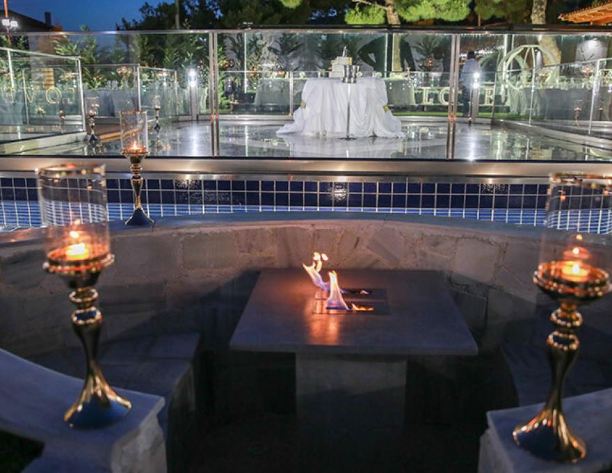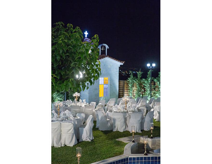 Το καταπληκτικό χαλί από γκαζόν, ο μοντέρνος φωτισμός, οι καταρράκτες καθώς και το γραφικό εκκλησάκι της Κοιμήσεως της Θεοτόκου συνθέτουν το ιδανικό σκηνικό για το γάμο των ονείρων σας.