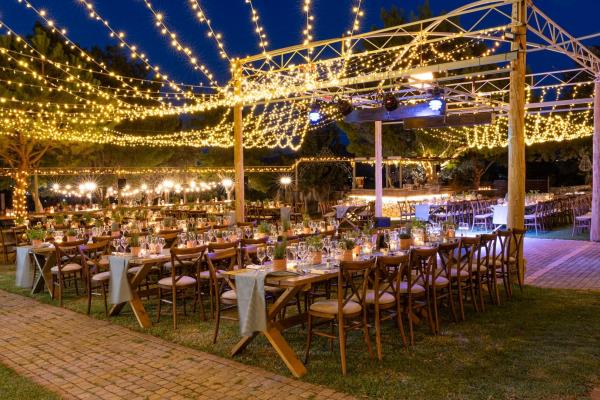 O υψηλής αρχιτεκτονικής αισθητικής στεγασμένος χώρος του κτήματος, πλαισιώνεται από υπέροχα φωτισμένες πετρόχτιστες επιφάνειες και ένα εντυπωσιακής κατασκευής στέγαστρο. Μπορεί να φιλοξενήσει έως 400 καλεσμένους και υπάρχει εύκολη πρόσβαση σε όλους τους χώρους για άτομα με περιορισμένη κινητικότητα. O χώρος μας είναι ελαφρώς υπερυψωμένος σε σχέση με το εξωτερικό περιβάλλον και με πανοραμική θέα σε όλο το κτήμα. Με τον τρόπο αυτό παρέχεται προστασία από τις καιρικές συνθήκες χωρίς να χάνεται η σύνδεση με το κτήμα και το φυσικό τοπίο.