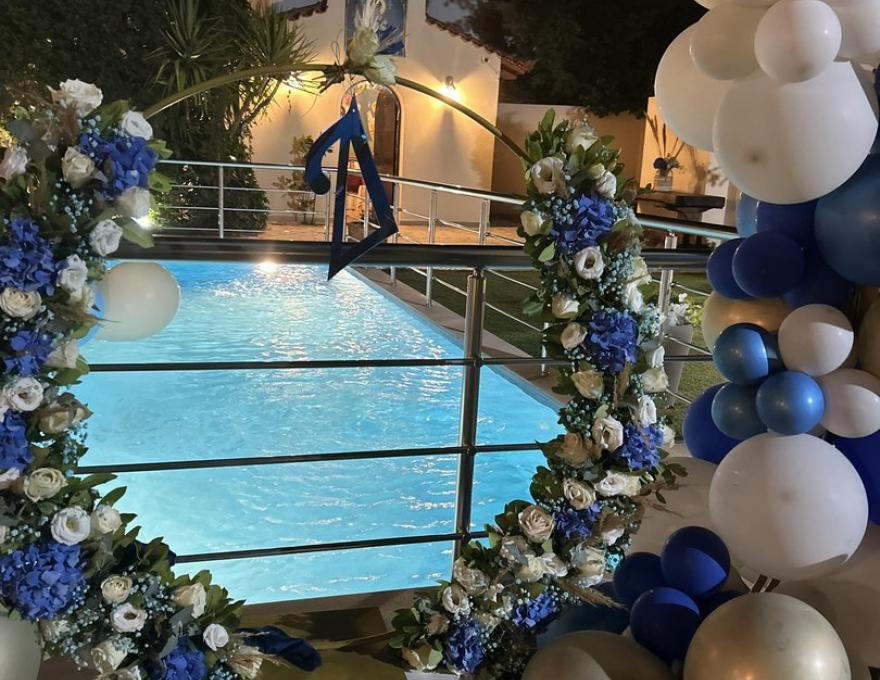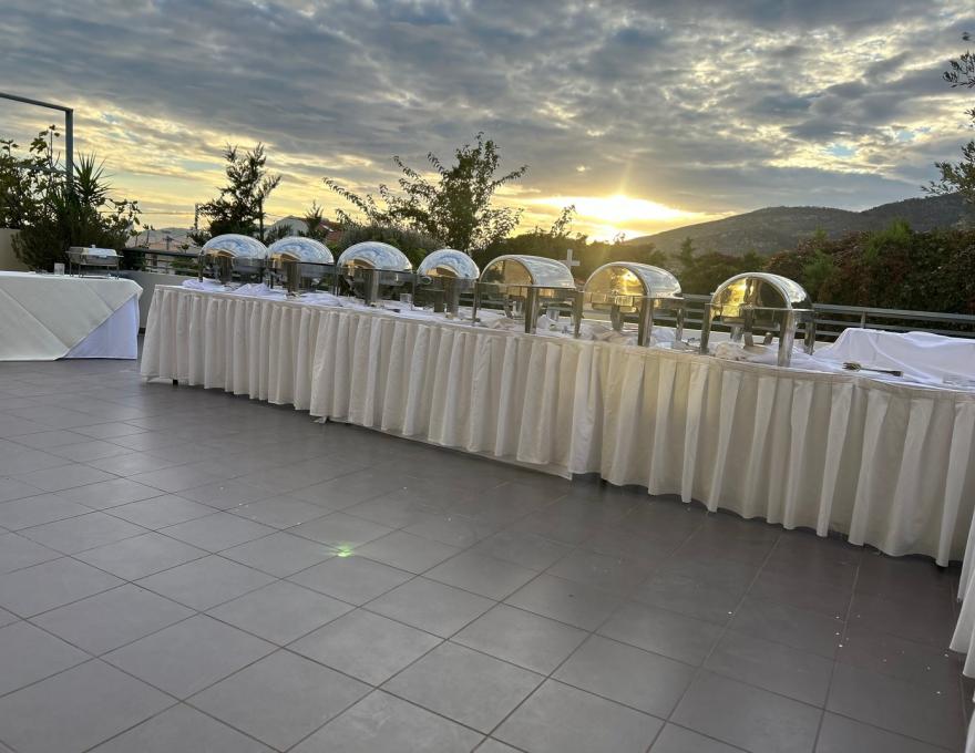Η νέα μας πολυτελής αίθουσα δίπλα στην πισίνα, με ανοιγόμενες οροφές και τζαμαρίες, προσφέρει την απόλυτη ευελιξία: ανοιχτή το καλοκαίρι, προστατευμένη και ζεστή τον χειμώνα – για ξέγνοιαστη γιορτή, ό,τι κι αν φέρει ο καιρός.