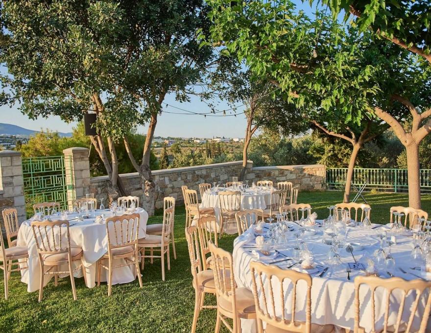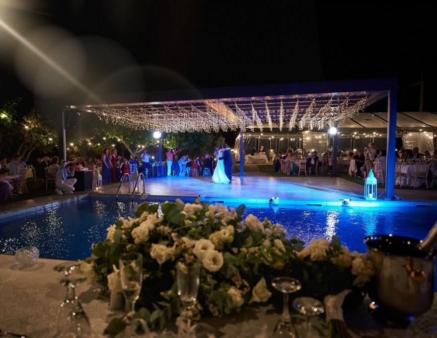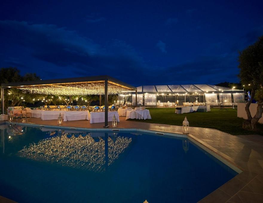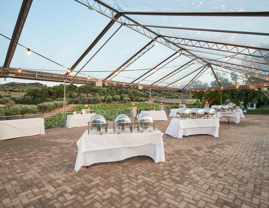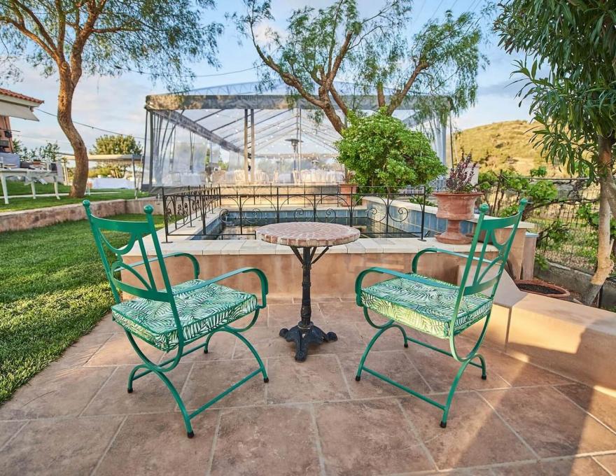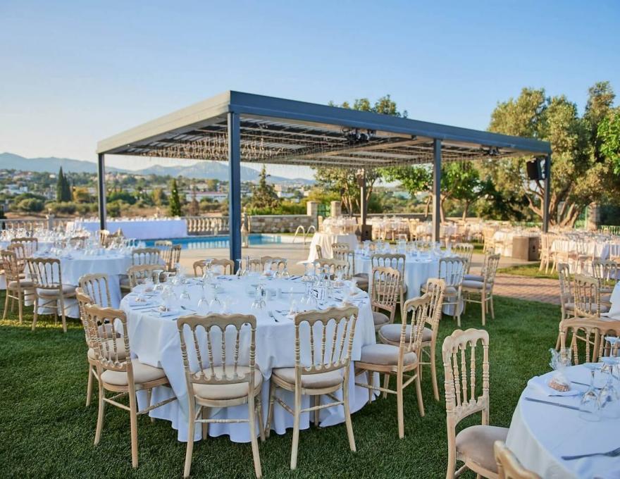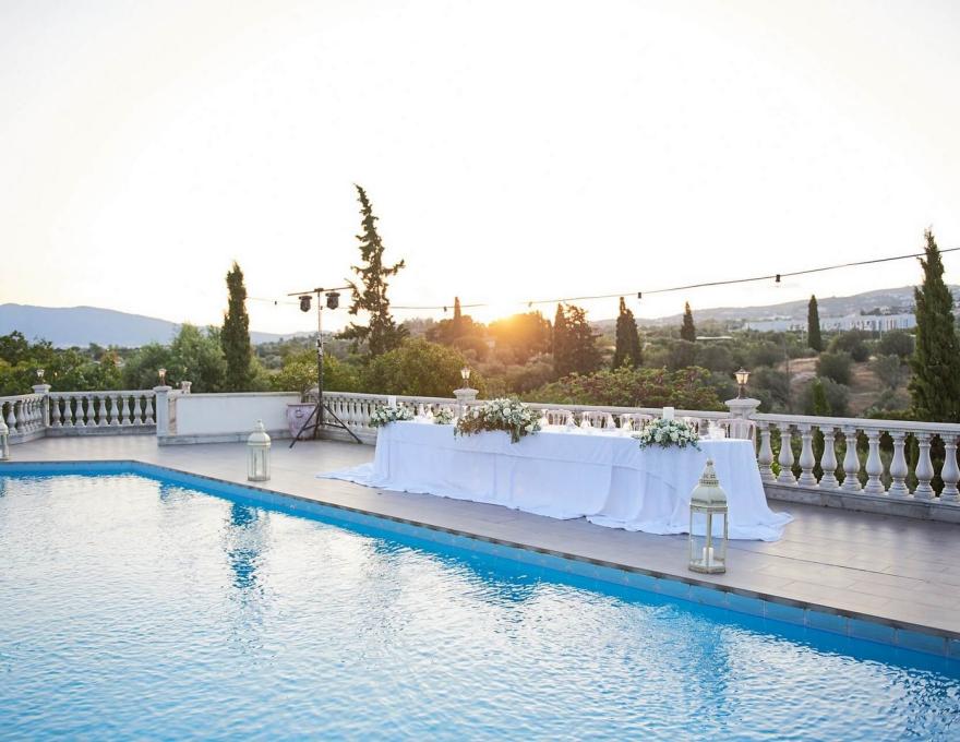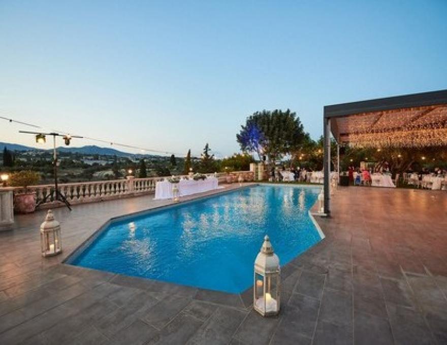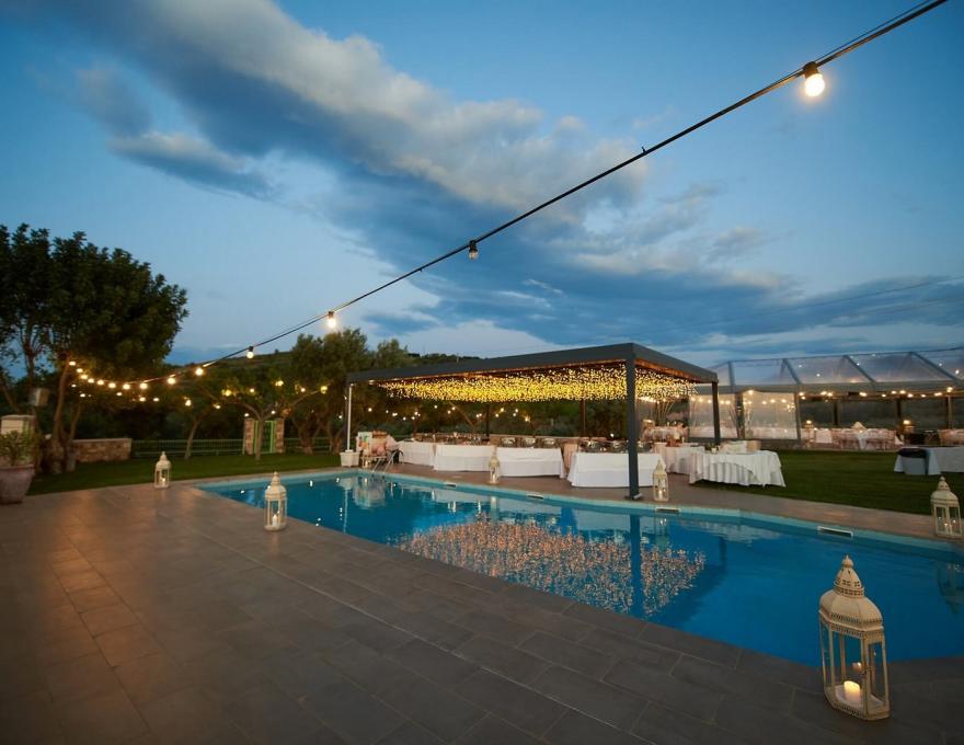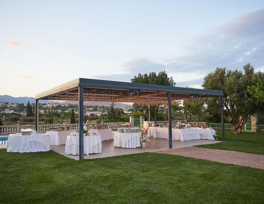Η ζεστασιά και η διακριτική πολυτέλεια του κτήματος, από την πρώτη στιγμή, δημιουργούν μία αίσθηση οικειότητας και απελευθέρωσης, βασικά συστατικά μίας επιτυχημένης δεξίωσης. Την επαφή με τον κατάφυτο εξωτερικό χώρο και την πισίνα δεν θα τη στερηθείτε ακόμα και σε περίπτωση βροχής, καθώς ο minimal αισθητικής στεγασμένος χώρος, με διάφανη οροφή, σας προστατεύει από τις καιρικές συνθήκες, χωρίς να διαταράσσεται η αρμονία του χώρου.