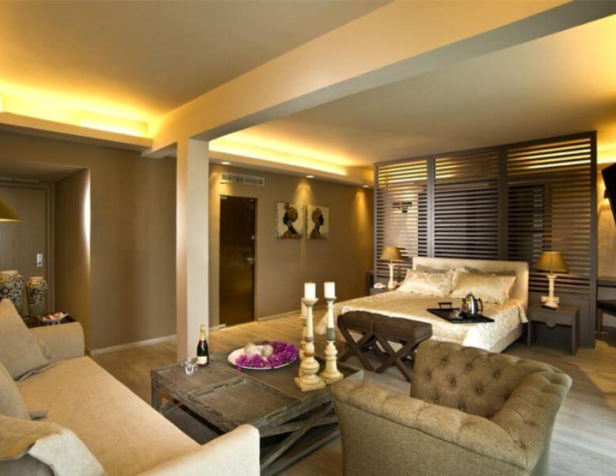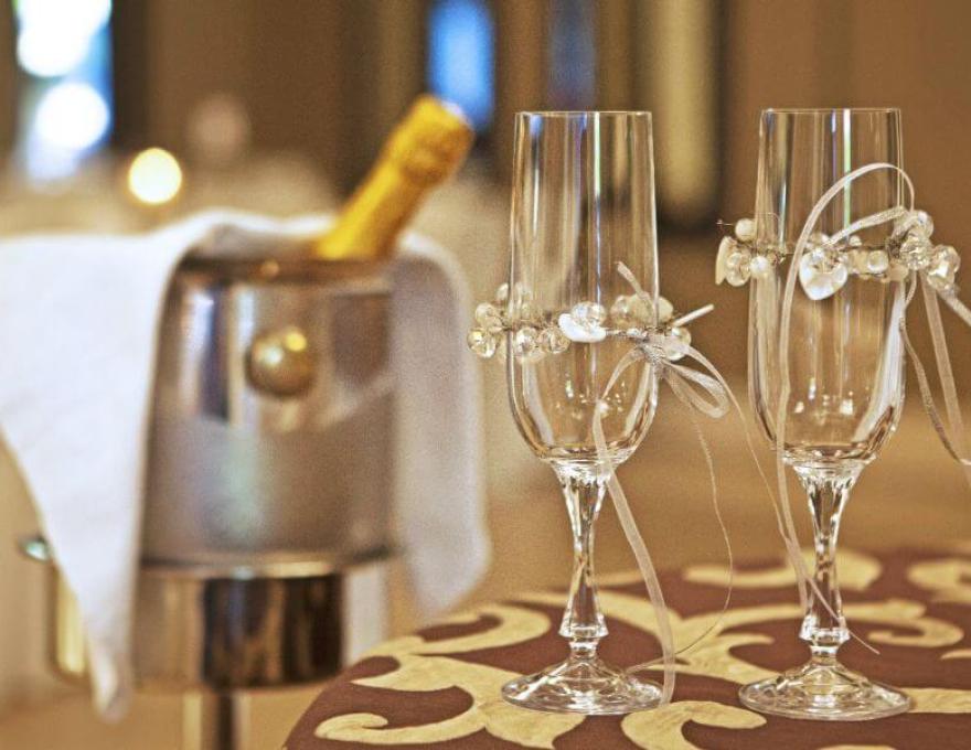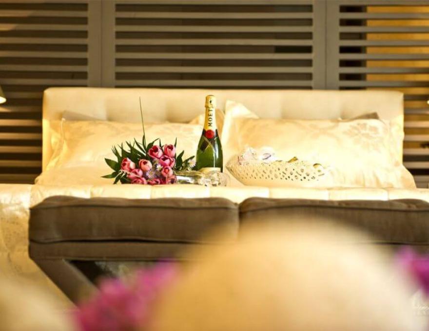 - Διανυκτέρευση για τους νεόνυμφους στη γαμήλια σουίτα με λουλούδια , σαμπάνια & πρωινό στο δωμάτιο