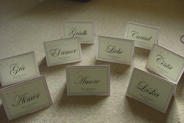 Μπορείτε να ονομάσετε τα τραπέζια σας από τις παραλλαγές μιας λέξης (π.χ. αγάπη) σε διάφορες γλώσσες. Εδώ προτείνουμε να γράψετε και τη γλώσσα (π.χ. αγγλικά, γαλλικά) για να το θυμούνται ευκολότερα οι καλεσμένοι σας.
