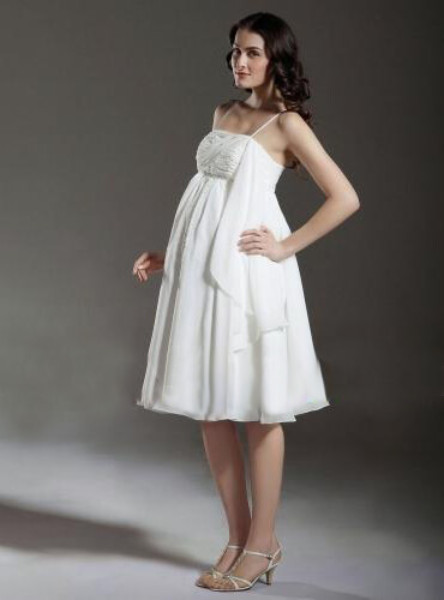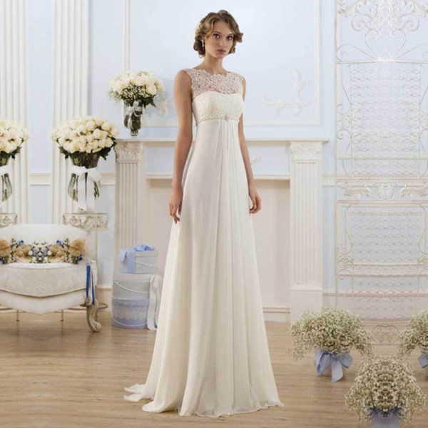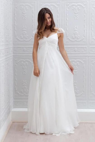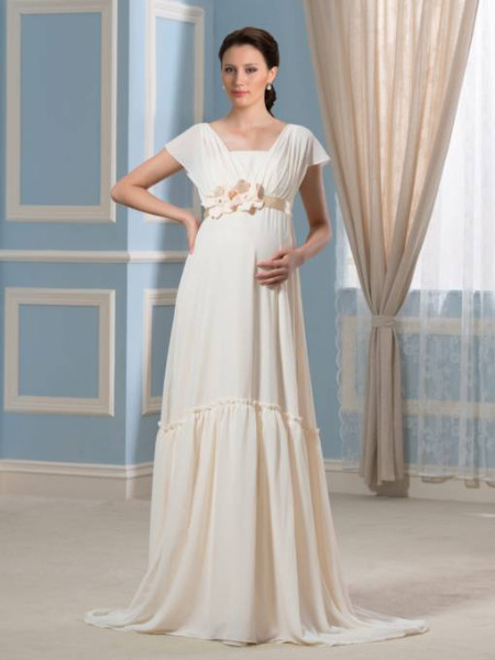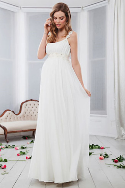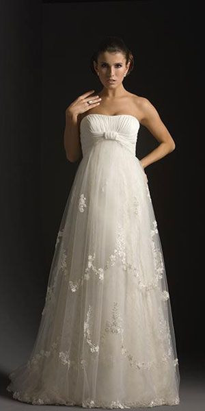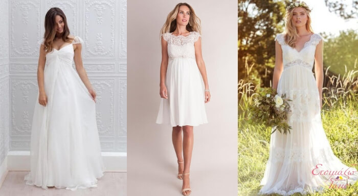 Οι προτάσεις μας για είναι ποικίλες. Εννοείται ότι το πατρόν του αμπίρ εξυπηρετεί και έχει προτιμηθεί από πολλές νύφες εγκυμονούσες. Το κόψιμο δηλαδή αντί για τη μέση είναι κάτω από το στήθος ώστε να μην υπάρχει πίεση στην κοιλιά. Η μουσελίνα είναι ένα απαλό ανάλαφρο ύφασμα όπου θα προσφέρει άνεση αλλά θα καταφέρει και ένα υπέροχο οπτικό αποτέλεσμα από λούκια και πτυχώσεις. Ίσως μια ελαφριά σουρίτσα στη μέση ή στο πλάι να καμουφλάρει και την κοιλίτσα, σε περίπτωση προχωρημένης εγκυμοσύνης. Αφήστε τη φαντασία σας ελεύθερη και στολίστε το κόψιμο του νυφικού με μια όμορφη ζώνη, ίσως χρωματιστή ή με πετράδια. Προσοχή αποφύγετε την υπερβολή, με μεγάλους φιόγκους και γενικότερα όγκους. Σκοπός είναι να αναδειχθεί όσο πιο όμορφα και αρμονικά γίνεται η σιλουέτα της εγκύου, όχι να τη παραμορφώσουμε και να δημιουργηθούν δυσανάλογοι όγκοι.