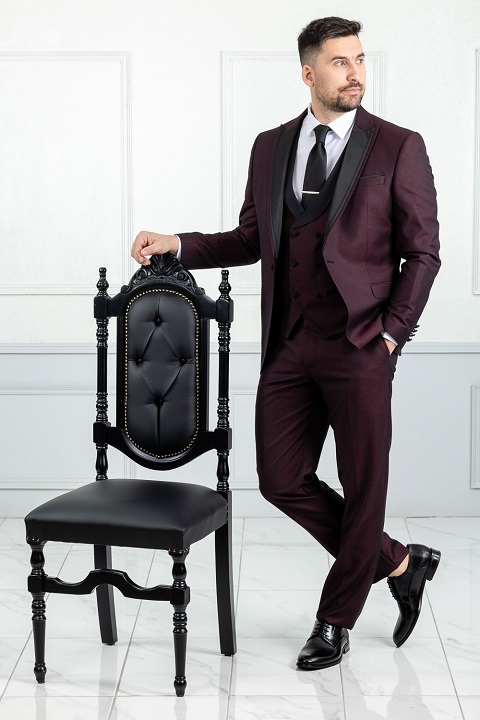 Από την άλλη, το μπορντό κοστούμι είναι πιο επίσημο, ειδικά αν συνδυάζεται με μαύρες λεπτομέρειες, και ταιριάζει τόσο σε χειμερινούς όσο και σε καλοκαιρινούς γάμους.