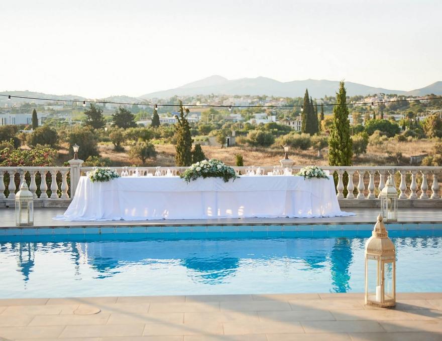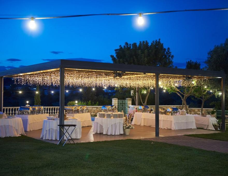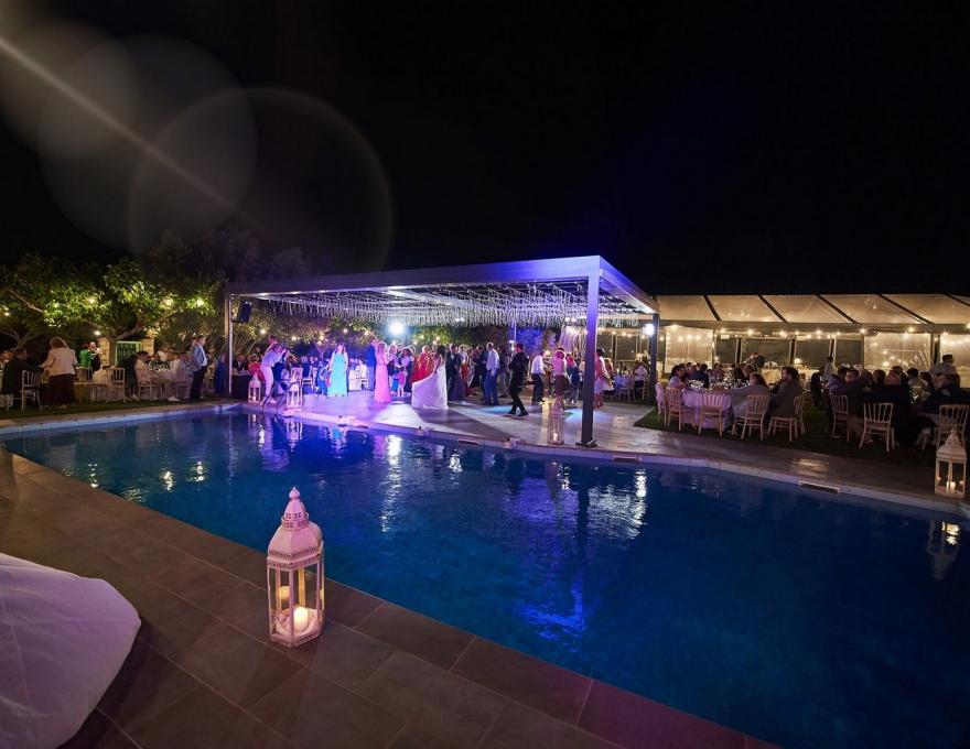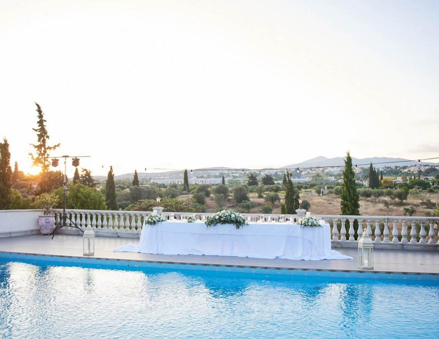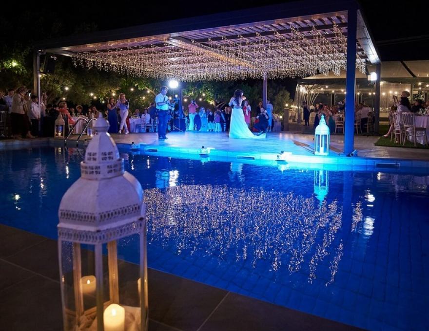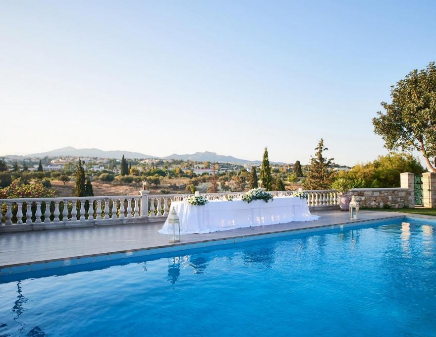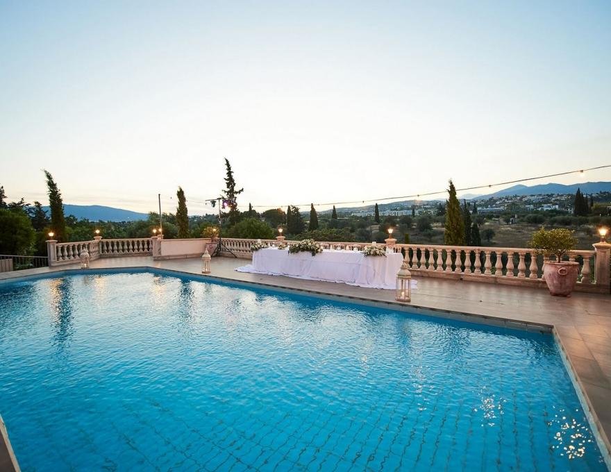 Η ζεστασιά και η διακριτική πολυτέλεια του κτήματος, από την πρώτη στιγμή, δημιουργούν μία αίσθηση οικειότητας και απελευθέρωσης, βασικά συστατικά μίας επιτυχημένης δεξίωσης. Την επαφή με τον κατάφυτο εξωτερικό χώρο και την πισίνα δεν θα τη στερηθείτε ακόμα και σε περίπτωση βροχής, καθώς ο minimal αισθητικής στεγασμένος χώρος, με διάφανη οροφή, σας προστατεύει από τις καιρικές συνθήκες, χωρίς να διαταράσσεται η αρμονία του χώρου.