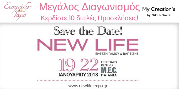 Το etoimazogamo.gr σε συνεργασία με τους My Creation's by Niki & Giwta σας προσφέρουν 10 διπλές προσκλήσεις για την έκθεση “NEW LIFE EXPO WEDDING” που θα διεξαχθεί 19-22 Ιανουαρίου 2018 στο MEC Παιανίας. Για να λάβετε μέρος στον διαγωνισμό κάντε τα παρακάτω: